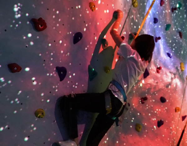 《太空漫步》利用人和裝置的互動(dòng),形象地科普宇宙物理概念—“能量磁場”。體驗(yàn)者在宇宙中攀爬探索,墻體互動(dòng)粒子會(huì)跟蹤體驗(yàn)者的運(yùn)動(dòng)軌跡,當(dāng)?shù)竭_(dá)不同的高度,會(huì)有不同的互動(dòng)回應(yīng),寓意著宇宙空間不同的位置具有不同的能量。