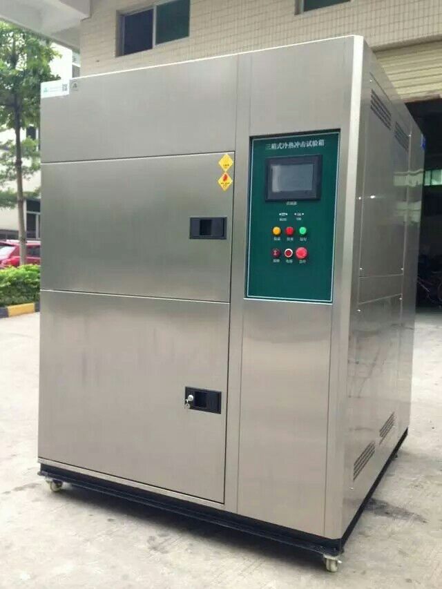 三箱式溫度沖擊試驗箱整體結構,試樣物品完全靜止試驗箱由預熱室、預冷室、工作室、制冷系統(tǒng)、加熱系統(tǒng)、風道系統(tǒng)、電器控制系統(tǒng)組成。工作室位于試驗箱中部,高溫室位于試驗箱下部,低溫室位于試驗箱上部,制冷機系統(tǒng)位于試驗箱的后下部,電器控制柜位于試驗箱右側面上部。